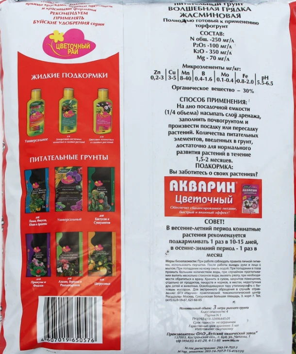 Количество товара в упаковке 6 ШтрихКод 4607019650576 Назначение удобрения или грунта Для садовых цветов и комнатных растений Объем (л) 3 Торговая марка Цветочный рай -