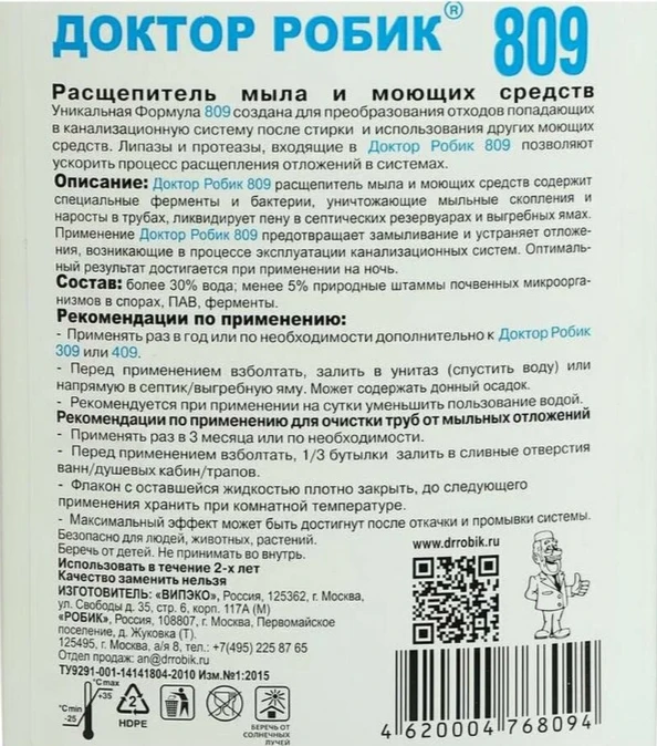 Доктор Робик 809 расщепитель мыла и моющих средств содержит специальные ферменты и бактерии, уничтожающие мыльные скопления и наросты в трубах, ликвидирует пену в септических резервуарах и выгребных ямах.