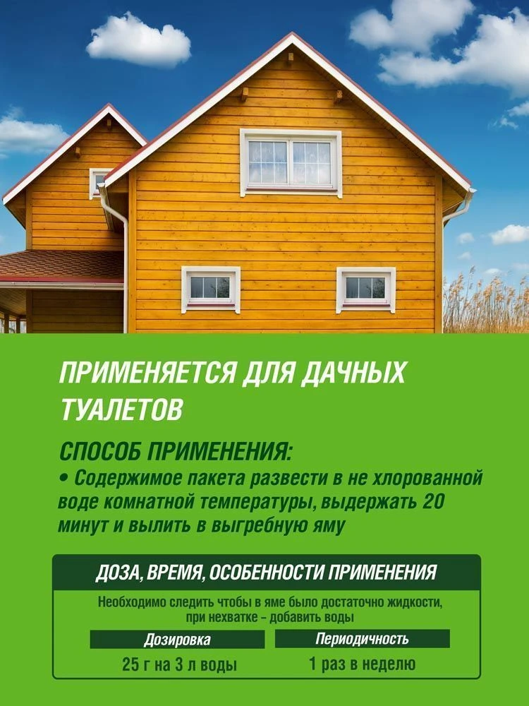 Препарат предназначен для удаления запахов и ускорения утилизации отходов жизнедеятельности человека, расщепления органических отходов, уменьшения объема осадка в дачных туалетах.
