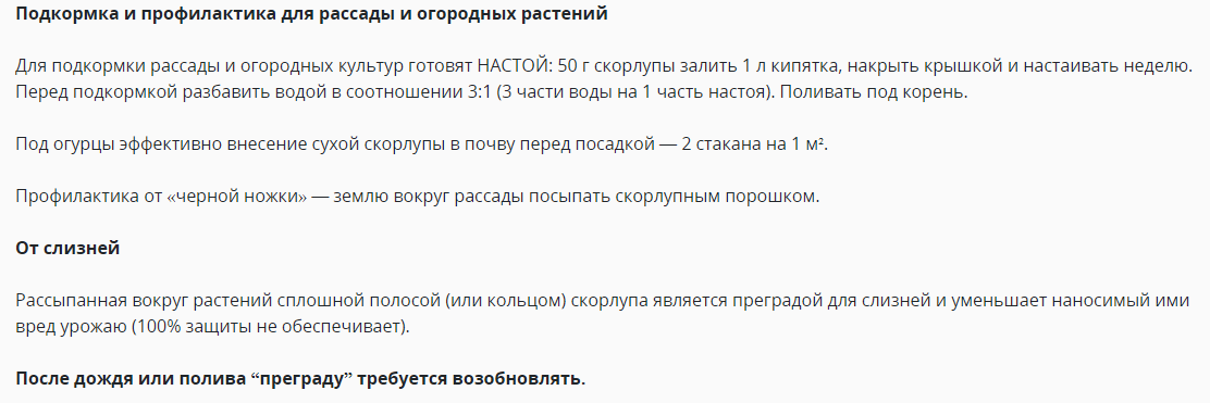 Используют: от слизней, улиток, черной ножки, для подкормки растений, и раскисления почвы.