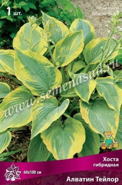 Алватин Тейлор - высота куста 60 см, ширина 100 см. Листья ширко-овальные, слегка волнистые, голубовато-серые с широкой неравномерной золотистой-желтой каймой.