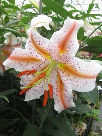 белый с оранжево-желтыми полосками по центру лепестков и пурпурным частым крапом, H-110см