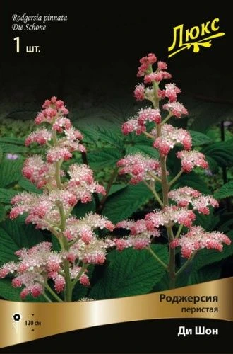 Роджерсия перистая - это очень крупное, поразительно красивое, можно сказать, экзотическое растение, которое всегда будет доминировать в вашем цветнике и привлекать к себе внимание. Высота растений 50-60 см, во время цветения вместе с соцветием 100-120 см. Листья перистораздельные на прочных крепких черешках длиной от 40 до 100 см. При распускании они пурпурные, позже – темно-зеленые, с рельефным жилкованием. Стебель сильно разветвленный. Соцветие — сложная метелка длиной 25-30 см с мелкими белыми или розовыми ароматными цветками. Цветет в течение 20-25 дней с первой декады июля.Ди Шон – высота растения 120 см, цветки розовые, листья темно-зеленые.
