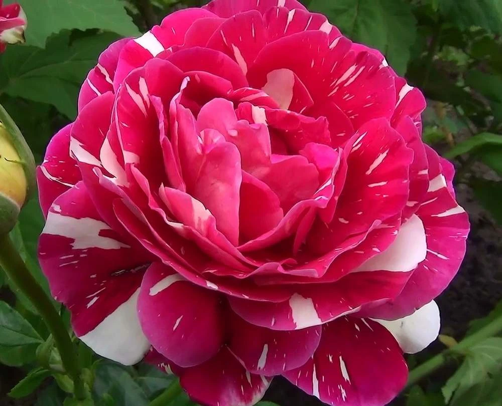 Цветки сорта – махровые и очень набитые (в каждом распустившемся бутоне насчитывается 60 – 70 пестрых лепестков), похожие на чашу. Поражают и размеры цветков – до 15 см в диаметре.