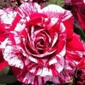 Цветы двухцветные, темно-бордовые, с белыми полосами, мелкие 5-6 см, густомахровые 45 леп. Куст среднерослый 65см, кустистый, обильно цветущий
