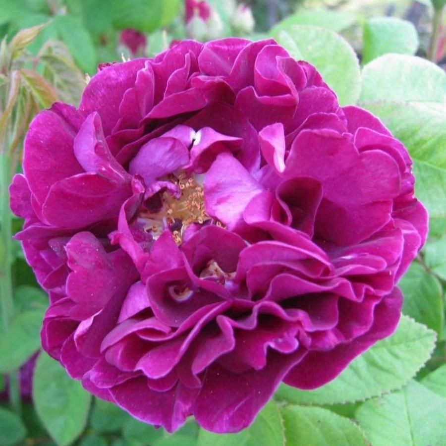 Уникальная историческая роза! На свете не так много выдающихся пурпурных роз, но эта великолепная галльская роза – одна из них. Цветет кистями округлых, чашевидных, махровых цветков около 7,5 см в диаметре, в небольших кистях. Цветки раскрываются бархатисто-темно-красными, постепенно становятся насыщенно-пурпурными, с более светлыми тонами или розовым оттенком с оборотной стороны лепестков, и белыми потеками у основания. Эта изумительная роза цветет только один раз за сезон, ранним летом, но пока она цветет, вы будете наслаждаться великолепными цветками и роскошной листвой. Побеги тонкие, дуговидно поникающие, почти без шипов. Сорт любит регулярный уход, для хорошего цветения на следующий год его нужно прореживать и обрезать после цветения. Можно использовать розу как плетистую, пустив по опоре. В бордере великолепен с серебристыми многолетниками, например полынями и шалфеями. Устойчив к заболеваниям, но иногда может поражаться черной пятнистостью.