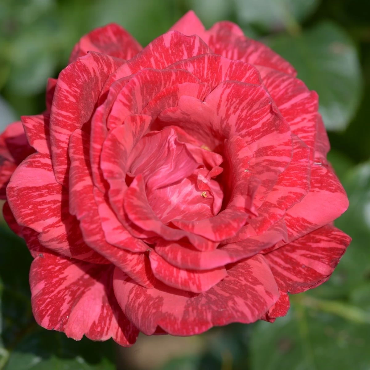 Цвет красный, с темно-красными полосами и пятнами. От 31 до 39 лепестков. Цветки от среднего до крупного, махровые, ветви несут главным образом одиночные цветки, бокаловидные, высокие в центре. Непрерывное цветения в течение всего сезона. Куст высокий, густой, без шипов (или почти). Высота 100-120 см, ширина около 70.