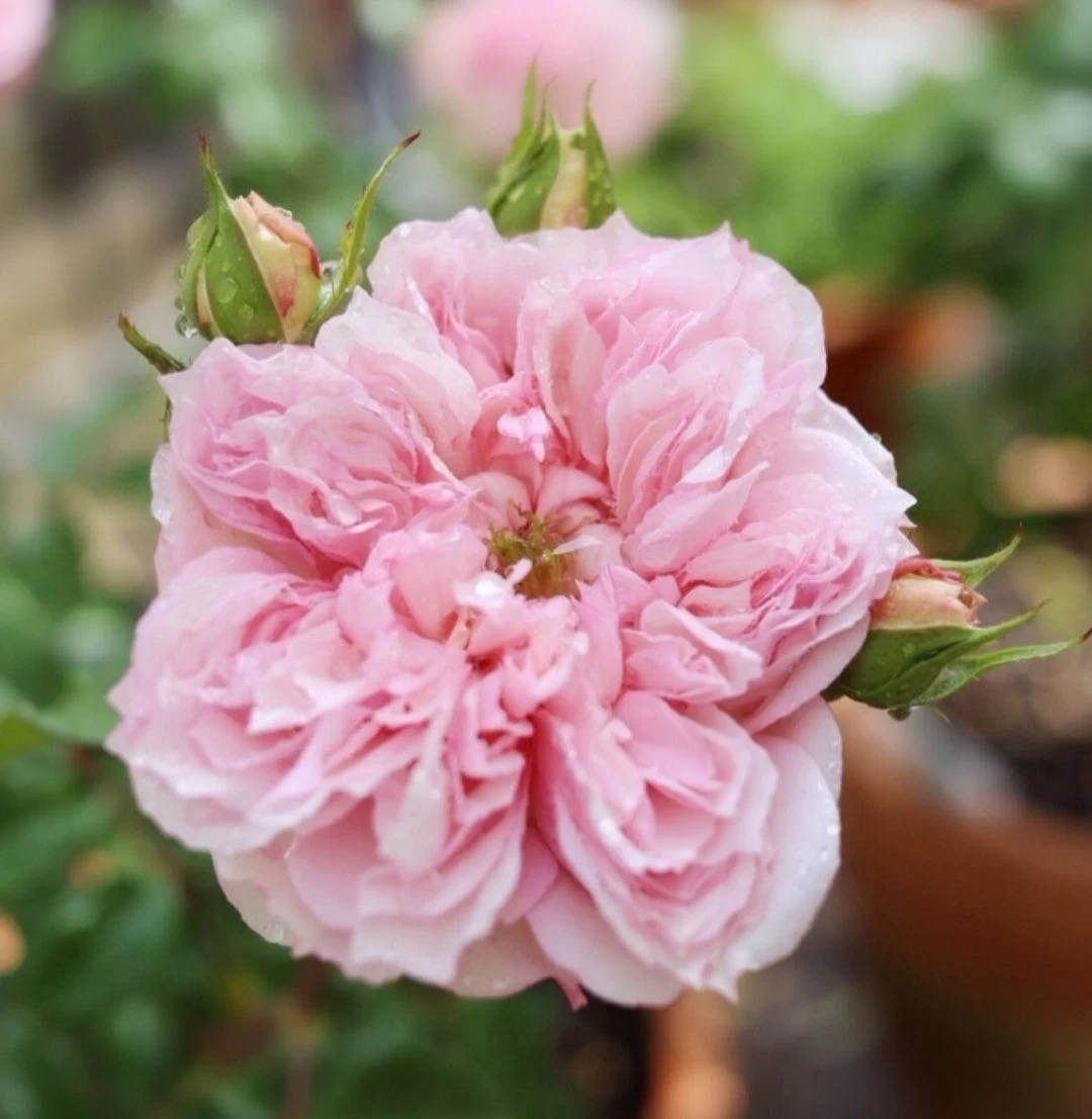 Бледно-розовые бутоны розы распускаются в очаровательные квартированные в четверть розетки цветков совершенно уникальной формы с "зеленый глазком" в центре и волнистыми лепестками различных оттенков розового. Они среднего размера 7-8см , махровые. Аромат умеренный. Куст компактный высотой 90-100 см. устойчив к дождю и болезням шраб, цветет обильно и повторно. Зимостойкость хорошая.