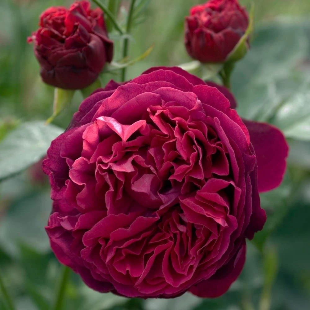 Цветки розы густо темно-малиновые , вначале яркие и насыщенные, позднее выгорающие до блеклого пурпурного, в условиях лёгкой затенённости становятся глубоко пурпурными. Цвет розы может меняться от темно-малинового до фиолетового на разных стадиях роспуска. Цветки имеют изысканную чашевидную форму, заполнены многочисленными короткими закрученными лепестками, которые сложены в центре, как будто в глубокой тарелке из внешних лепестков ,что создает потрясающий сияющий эффект. Далее лепестки образуют рыхлую розетку, но могут быть с пуговкой в центре или квартированные. Диаметр цветка 10-12 см. Аромат мощный, как у старинных роз. Высота куста 120-150см.
