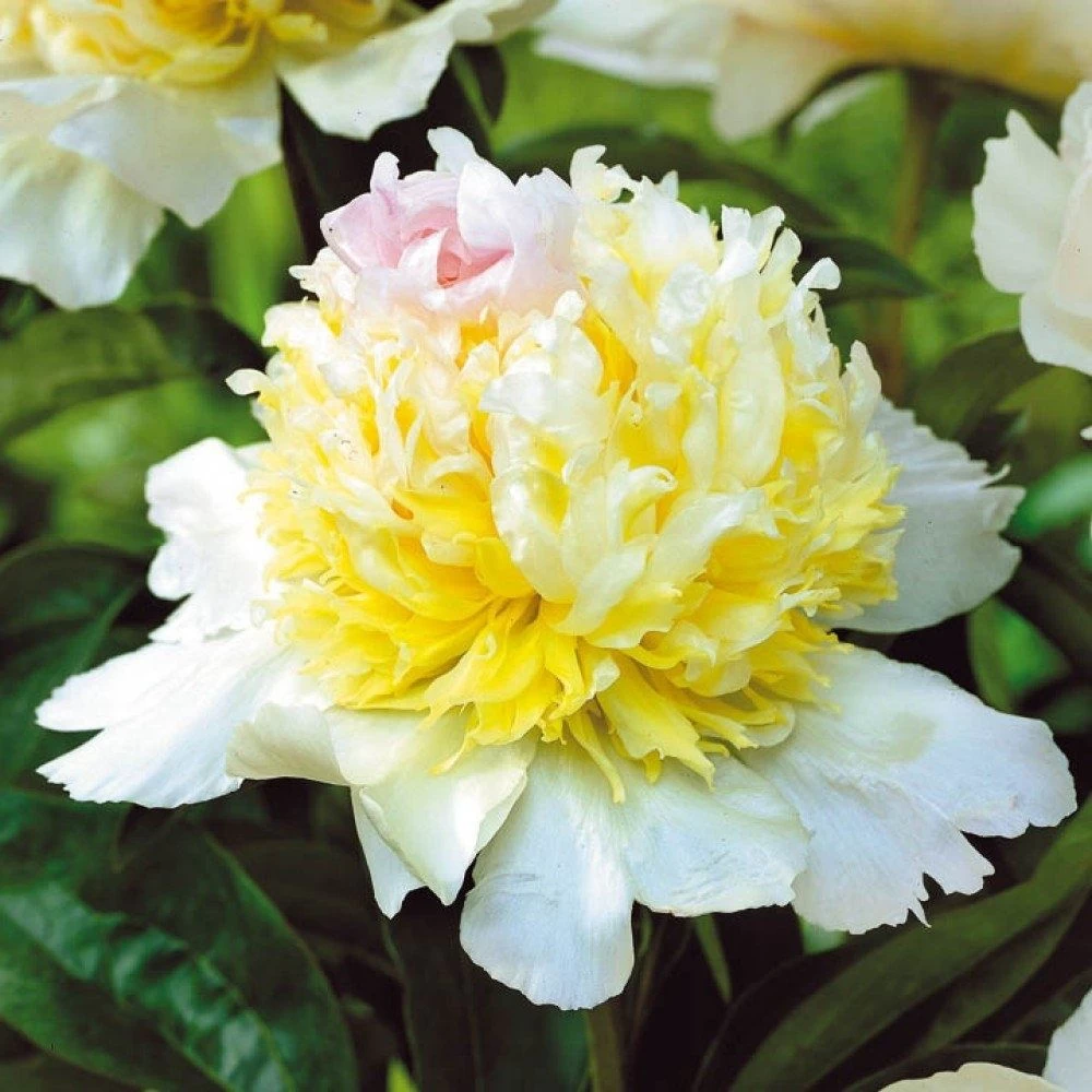 первый ряд содержит широкие светлые лепестки, а второй и третий заполняют узкие лепестки, розовые и желтые.