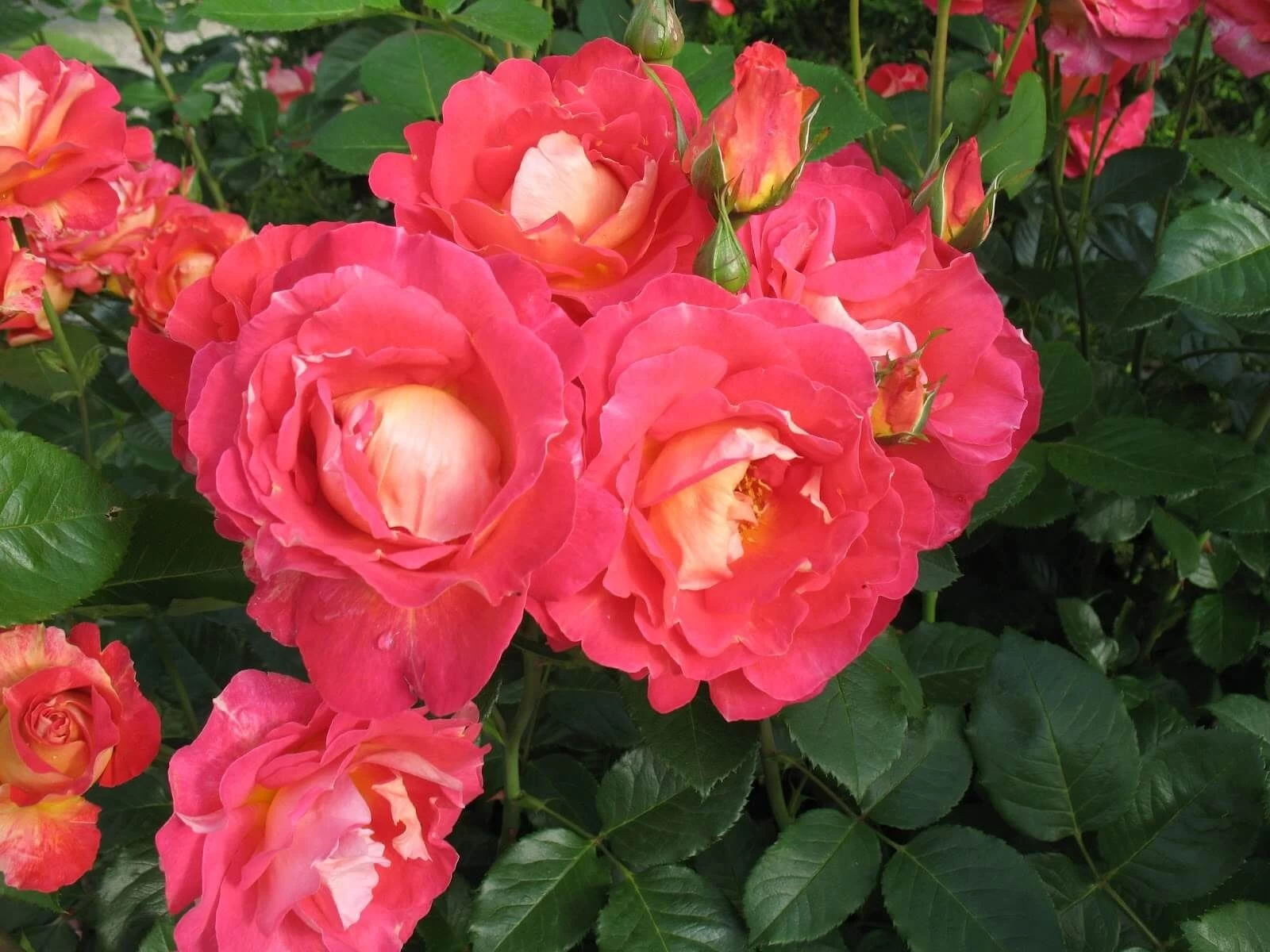 Крупные землянично-красные цветки с розовато-желтой оборотной стороной лепестков.
