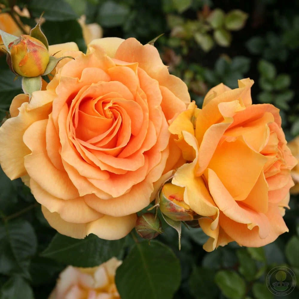 Плотные ярко-оранжевые бутончики сформированы в соцветия (3−5 шт.), а после распускания они становятся махровыми, ностальгическими, переливчатыми золотисто-янтарными цветками средних размеров (6-10 см диаметром).