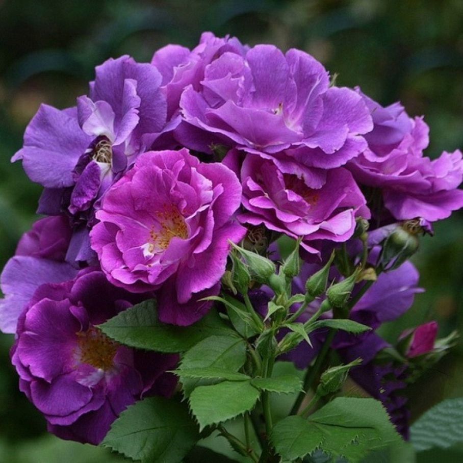 Одна из самых голубых роз с превосходным ароматом. Кусты высотой 70-120 см, прямостоячие. Листья светло-зеленые, глянцевые, немного удлиненные, овальные, с заостренным кончиком и отчетливо видной центральной прожилкой. Цветы диаметром 5-96 см пурпурно-фиолетовые с белой серединкой и желтыми тычинками, часто собраны в зонтики, на одном стебле могут формировать до 5 штук. Цветение обильное, продолжительное.