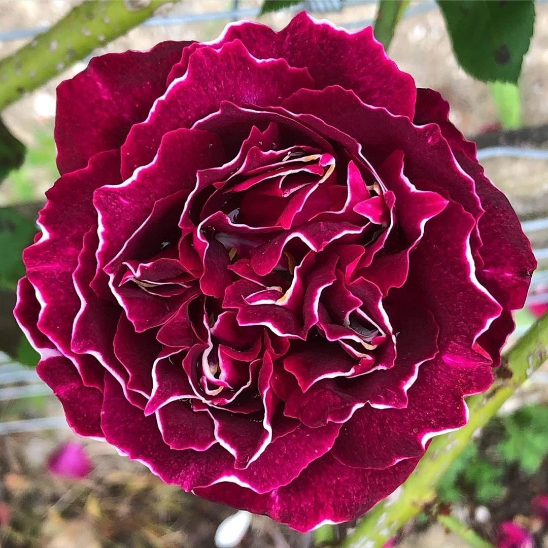Старинный французкий сорт, с хорошей морозостойкостью и устойчивостью к болезням. Кусты выглядят неряшливо, прямостоячие, с длинными поникающими побегами, высотой 110-150 см. Листва темно-зеленая, широкая, на побегах многочисленные шипы. Цветы в диаметре 8-12 см очень ароматные, чашевидные, махровые, темно-пурпурно-красные с белым кантом на отгибающихся лепестках.