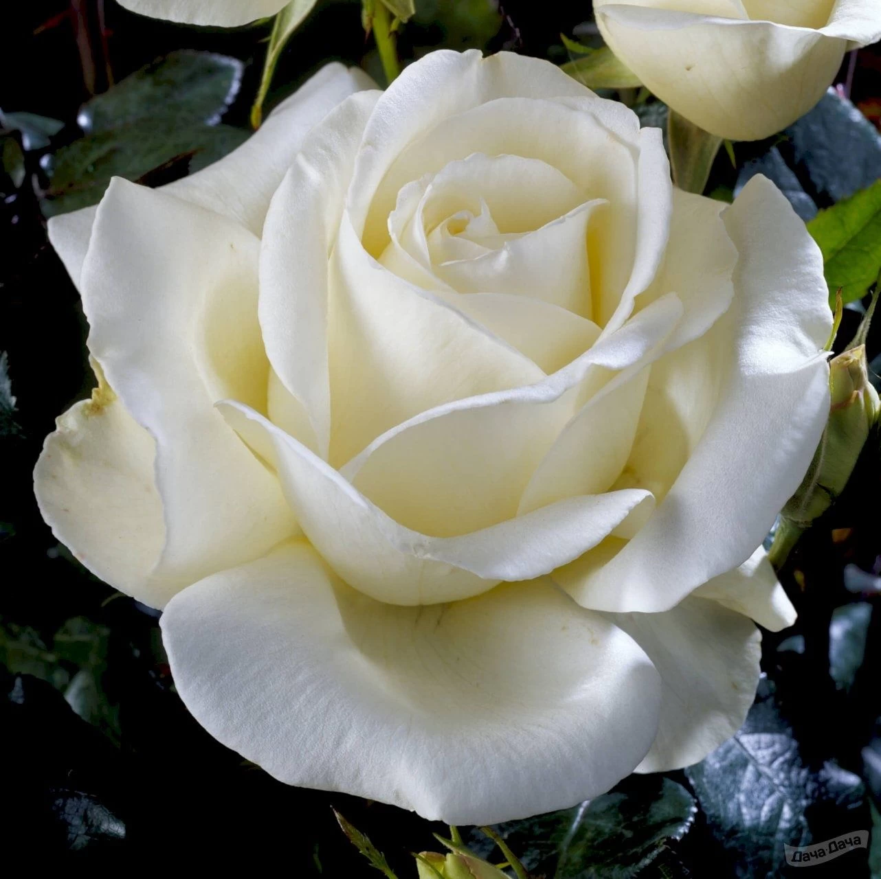 Изысканная роза, с утонченным ароматом. Бутоны вытянутые, плотные, зеленовато-белого цвета, раскрываются в густомахровую (50-55 лепестков), белоснежную розу бокаловидной формы. Кусты прямые, высокие, с темно-зелеными, матовыми листьями. Сорт обильноцветущий.