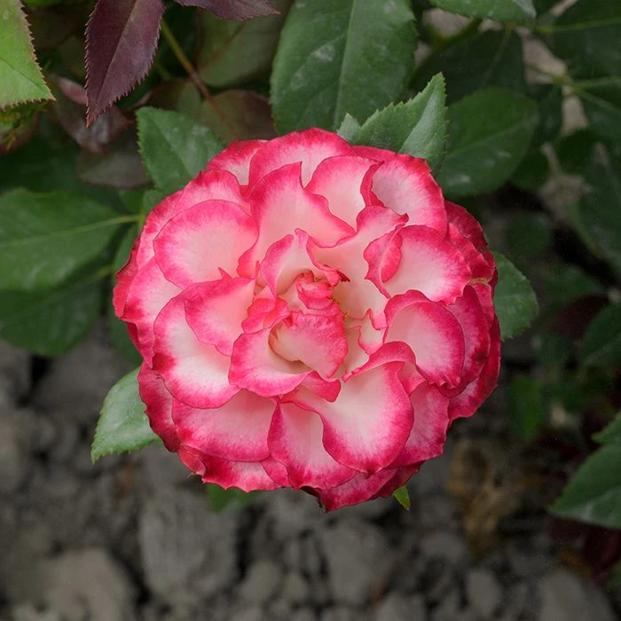 Изящная срезочная роза. Цветы кремовые, с ярко-розовым краем, густо махровые, помпоновидные. Небольшие бутоны, распускаются вихрем пестрых лепестков, окрашенных в кремовые оттенки у основания и красно-розовые на кончиках. Кончики махровые, неровные. Аромат тонкий, едва уловимый. Благодаря россыпи пестрых цветов на невысоких кустах с темно-зеленой листвой, сорт идеален для украшения клумб и ландшафтных композиций.