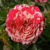 Бутоны классической формы раскрываются в крупные, малиново-красные цветки с белыми полосками, очень эффектно выглядящие в саду. Цветение обильное, длительное. Куст хорошо облиственный, сильнорослый, в жарком климате может вырастать до 1 м в высоту. Листва светло-зеленая. Сорт среднеустойчив к болезням.