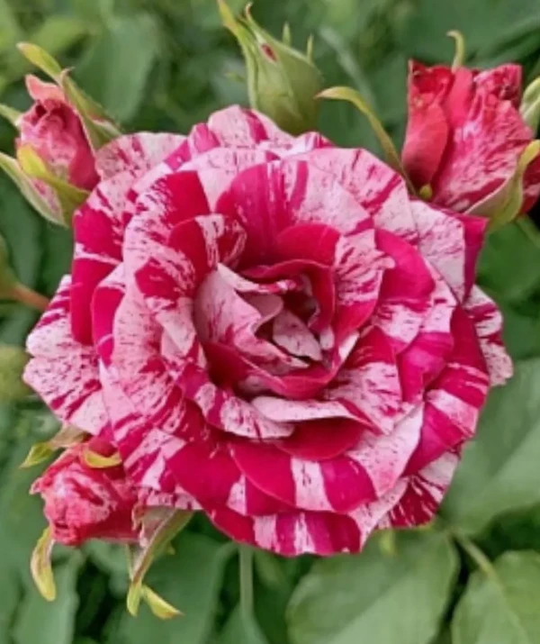 Роза Арроу фолиес была выведена в 2002 году в США. Цветы среднего размера от 4 до 6 см раскрываются в соцветиях, в которых может быть от 5 до 10 штук. Особенно привлекательна их окраска. По лепесткам пурпурно-розового цвета, разбросаны поперечные полоски пастельного розового и почти белого оттенка. Кусты образованы прямыми, разветвленными побегами с крупными шипами. Листва темно-зеленая, полу глянцевая.