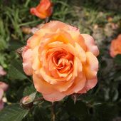 Цветы крупные, густомахровые, абрикосово-оранжевого цвета. Долго держатся на кусте, не выгорают. Аромат пряный, сладкий, с легкой ноткой специй. Цветение обильное и продолжительное. Начинается в июне и длится, с небольшими перерывами, до самой осени. Бутоны устойчивы к дождю. Растение сильнорослое, аккуратное. Побеги крепкие, прямостоячие. Листья глянцевые, среднего размера, темно-зеленого окраса. Чудесный сорт, который особенно хорош при посадке небольшими группами.
