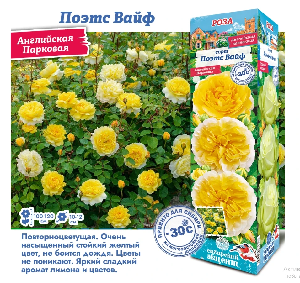 Это великолепная роза с цветами не выгорающего насыщенно-желтого цвета. Их форма очень красива: кольцо из аккуратно сложенных внешних лепестков обрамляет внутренние лепестки, расположенные менее строго. Куст невысок и от природы округлой формы, поэтому идеально подходит для переднего плана цветников. Роза обладает насыщенным ароматом: сначала в нем сильны лимонные нотки, с возрастом цветка он становится слаще и сильнее.