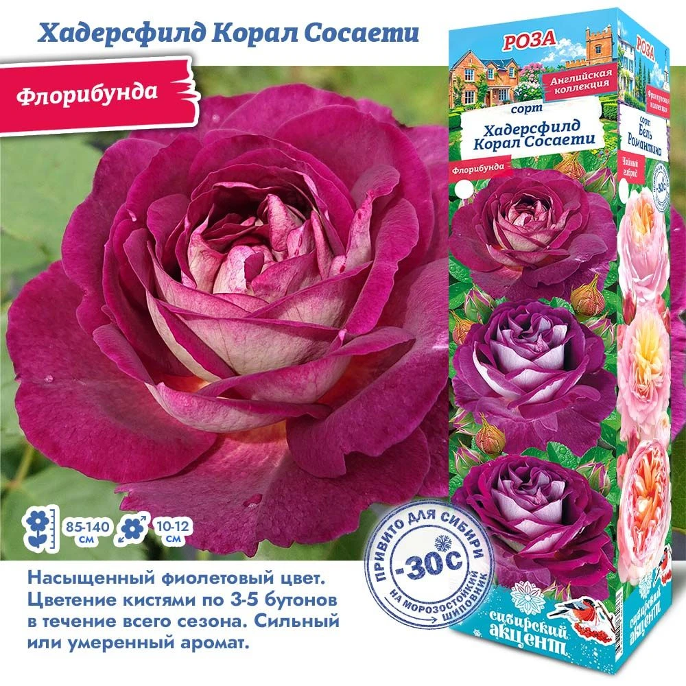 Махровые, чашевидные цветки с умеренным ароматом. От фиолетового до нежно-фиолетового, белый реверс. Куст прямостоячий, листва полу-глянцевая, темно-зеленая.