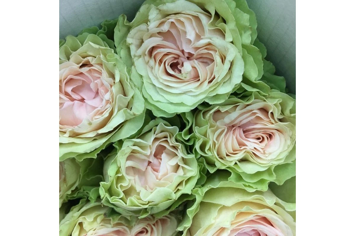 Высота куста 50-60 см во время цветения куст почти скрывается под аккуратными букетиками довольно крупных цветков с лепестками-рюшечками. Цветы махровые диаметром 8-10 см от нежно-розового, почти фарфорового, до изумрудно-салатового. Бутоны плотные, расположены букетами на концах побегов. Листва тёмно-зеленая, глянцевая. Куст устойчив к дождю, жаре, болезням, цветет обильно и повторно.
