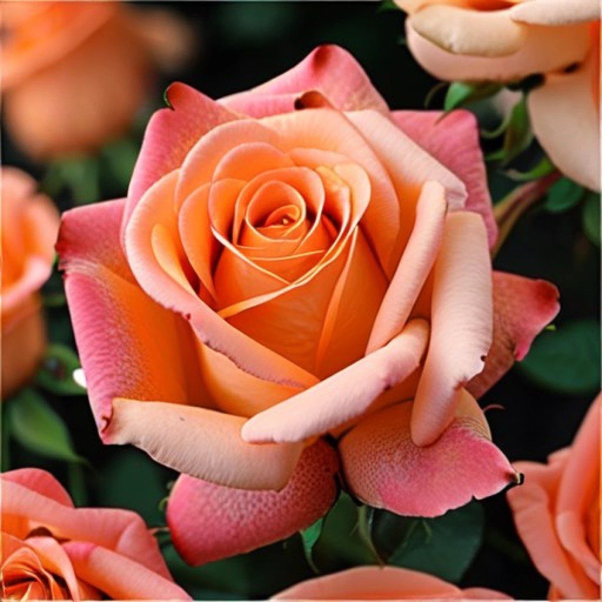 Куст высотой 80-100 см и в ширину 80 см. Листья имеют темно-зеленый цвет и овальную форму с заостренным кончиком. Цветки диаметром 8-10 см, ярко-мандориновые с оттенками золотого и розового, махровые, обладают нежным, но достаточно выраженным ароматом. Зимостойкость высокая. Цветение обильное и продолжительное.Каждый стебель украшает один цветок.