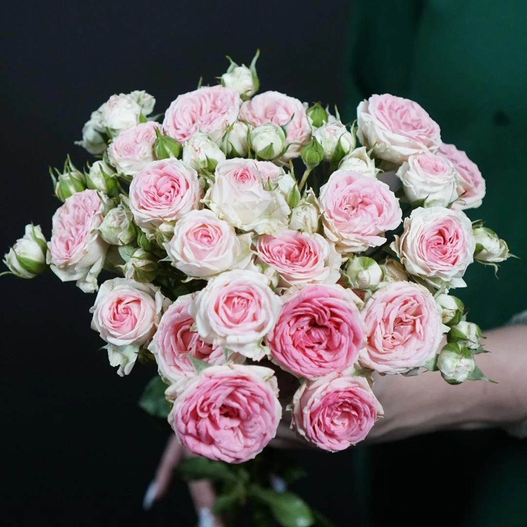 Отличная роза для букетов. Цветы диаметром 4-6 см собраны в большие соцветия розовые с зеленовато-кремовыми крайними лепестками, округлые, плотные, густомахровые, долго держатся на кусте. Куст высотой 70-80 см. Устойчива к морозам и болезням. Цветет обильно.