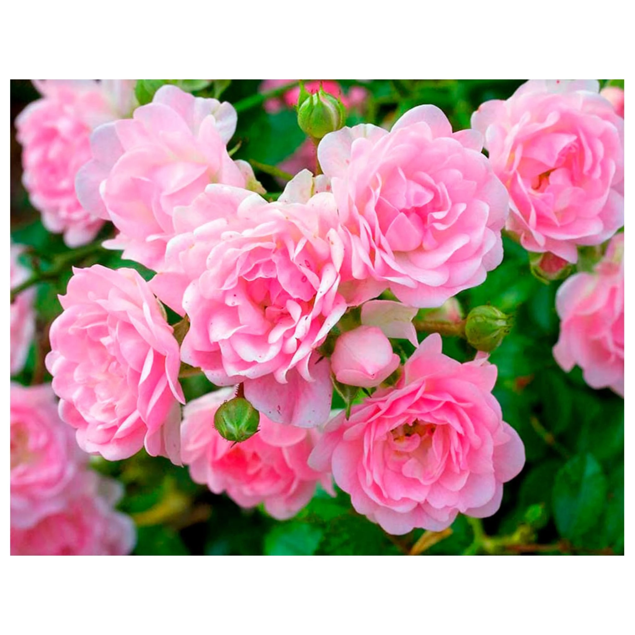 Роза почвопокровная - куст компактный высотой от 60 до 75 сантиметров. Стебли длинные, мощные, стелющиеся. Во время цветения обильно покрыты бутонами. Листовые пластины глянцевые, кожистые, с зубчатыми краями, насыщенно-зеленого цвета. Цветки нежно-розовые, образованы маленькими волнистыми лепестками. Бутоны чашевидные, полумахровые. Диаметр – 2-2,5 см. На одном стебле располагается от 7 до 20 цветков. Аромат нежный слабый. Цветение обильное и продолжительное, происходит в 2 волны. При отцветании лепестки становятся более тусклыми и постепенно отклоняются в стороны, после чего опадают.
