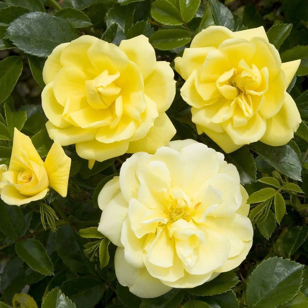 Цветы диаметром 4-6 см желтого цвета, чашевидные, полумахровые хорошо сочетаются с темной блестящей листвой. Собраны кисти по 10-20 шт. Сорт устойчив к болезням, влажности и жаре. Цветение продолжается волнами длительный период: с раннего лета и до морозов. Куст высотой 60-80 см раскидистый.