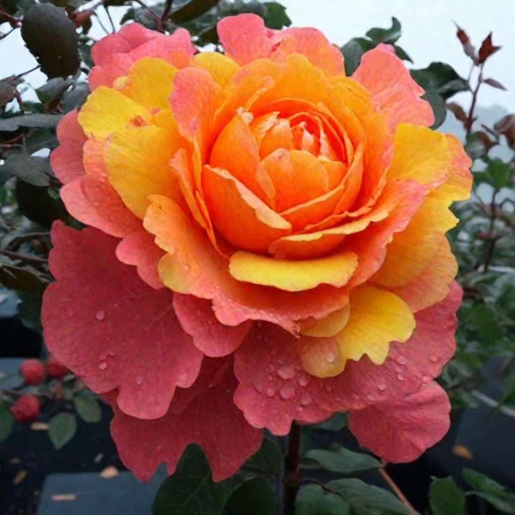 Очаровательная, крупноцветковая и повторноцветущая, с хорошим иммунитетом и устойчивостью к палящему солнцу. Куст высотой 90-120 см пышный, аккуратный. Цветы диаметром 11-12 см желто-оранжевые с розово-красной каймой, густомахровые, лепестки волнисто-гофрированные, часто резные. Аромат мягкий.