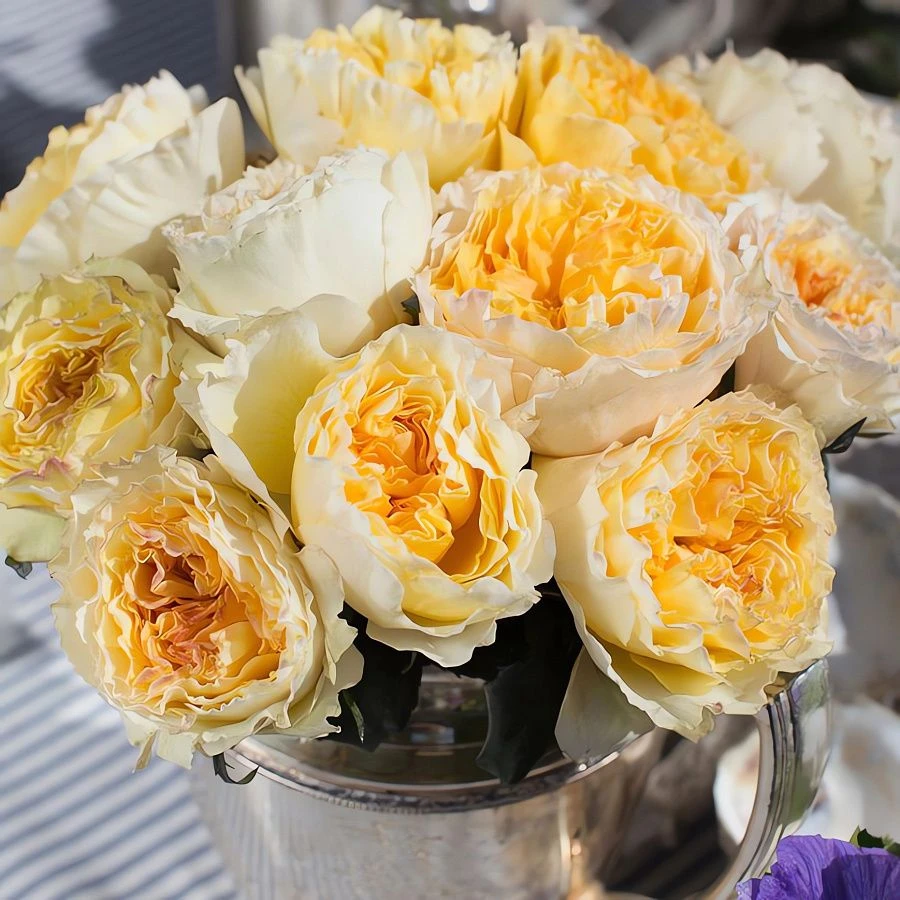 Куст высотой 75 см, прямостоячий. Стебли мощные и прочные, шипов практически нет. Листья небольшие, с глянцевой поверхностью, темно-зеленой окраски. Цветы диаметром 10 см, чашевидные, густомахровые, абрикосово-желтые, при наступлении более холодной погоды становятся абрикосовые, наружные лепесточки – светло-желтыми. Аромат цветов интенсивный, с нотками меда, сирени и миндаля. Цветение обильное и непрерывное до прихода морозов – с июня по октябрь. В срезке стоит 8-10 дней.