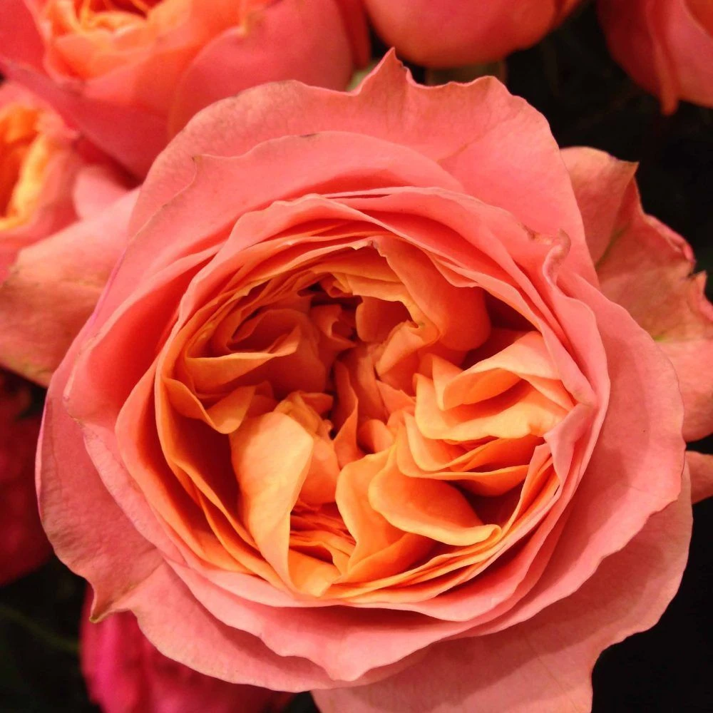 Куст этого сорта прямостоячий и достигает высоты до 110 см. Цветы старинной формы, густомахровые, в диаметре 10-12 см, персиково-коралловые внутри и ярко-розовые снаружи, долго сохраняются на кусте и в срезке. Аромат легкий. Цветение обильное почти непрерывное. Устойчива к заболеваниям.