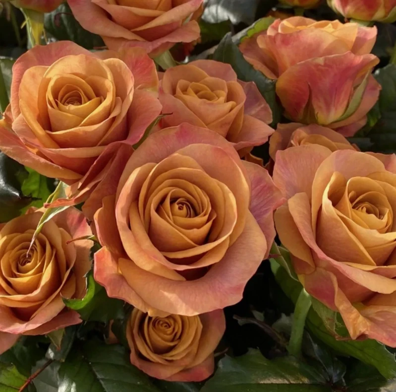 Необыкновенная роза с крупными густомахровыми цветами диаметром 10-11 см, золотисто-коричневого или песочно-коричневого цвета. Куст высотой 100-120 см прямостоячий. Листва темно-зеленая, глянцевая.