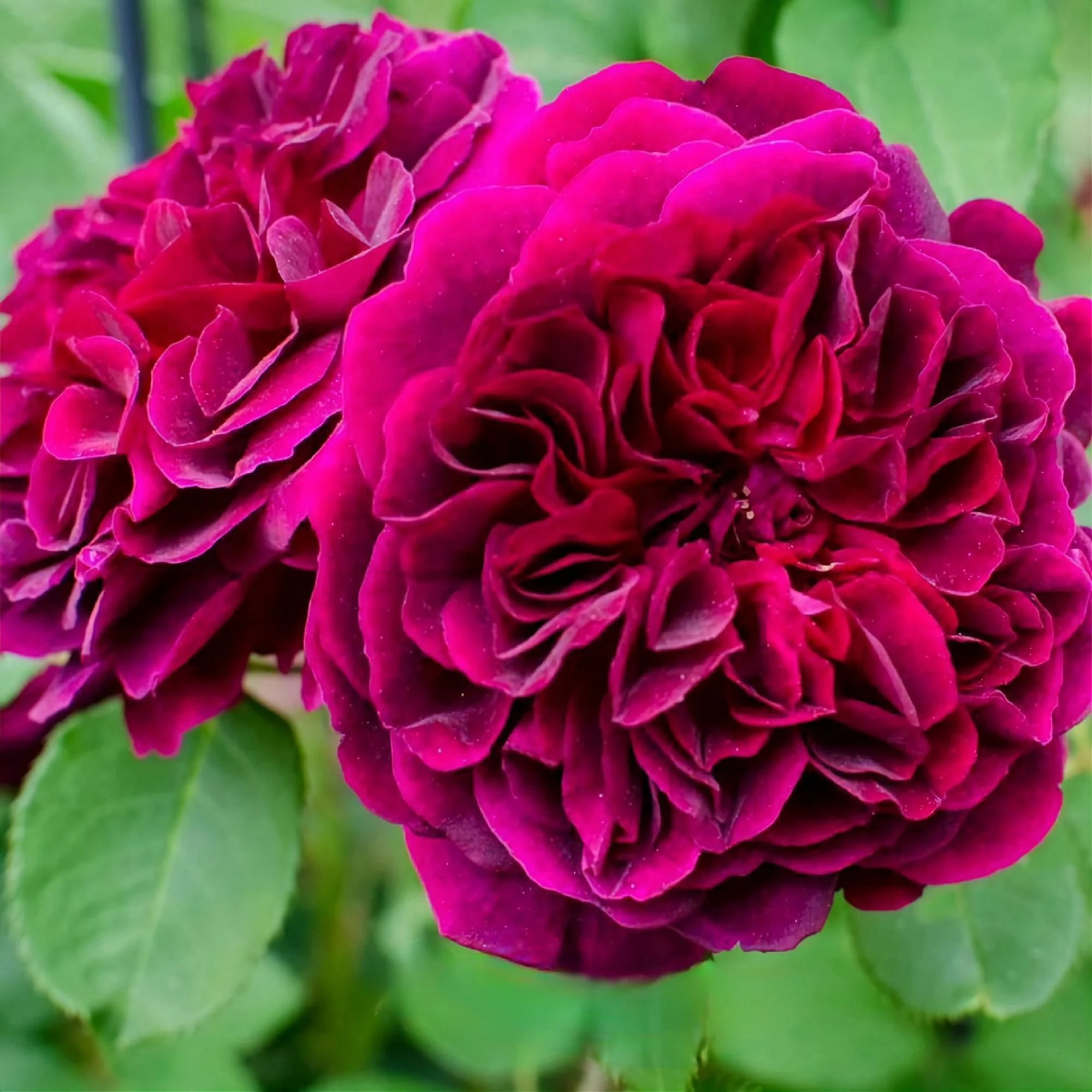 Розовые бутоны с бордовым центром по мере роспуска меняют цвет на вишнево-малиновый. Цветы диаметром 8-10 см, бархатистые, крупные, чашевидные, обладают сильным сладко-фруктовым ароматом розового масла с нотками черники, голубики и терна. Куст высотой 90-100 см ветвистый, широкий. Молодые листья красно-бронзовые, взрослые ярко-зеленые. Цветет обильно и повторно. Довольно устойчива к болезням и дождю.