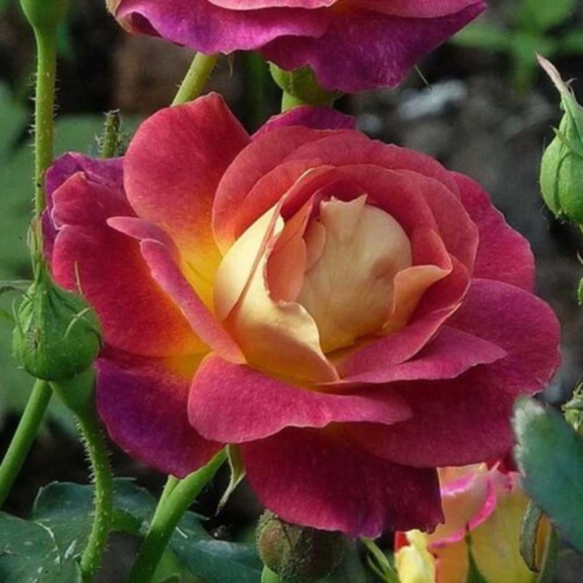 Интересная роза-биколор с мягким ароматом. Устойчива к болезням, не реагирует на дождь, может выращиваться как плетистая, высота куста 100-200 см. Цветет пышными волнами. Цветы диаметром 6-8 см чашевидные, махровые, клубнично-розовые с желтым центром и изнанкой лепестков, с возрастом могут приобретать сиренево-пурпурный оттенок или светлеть.