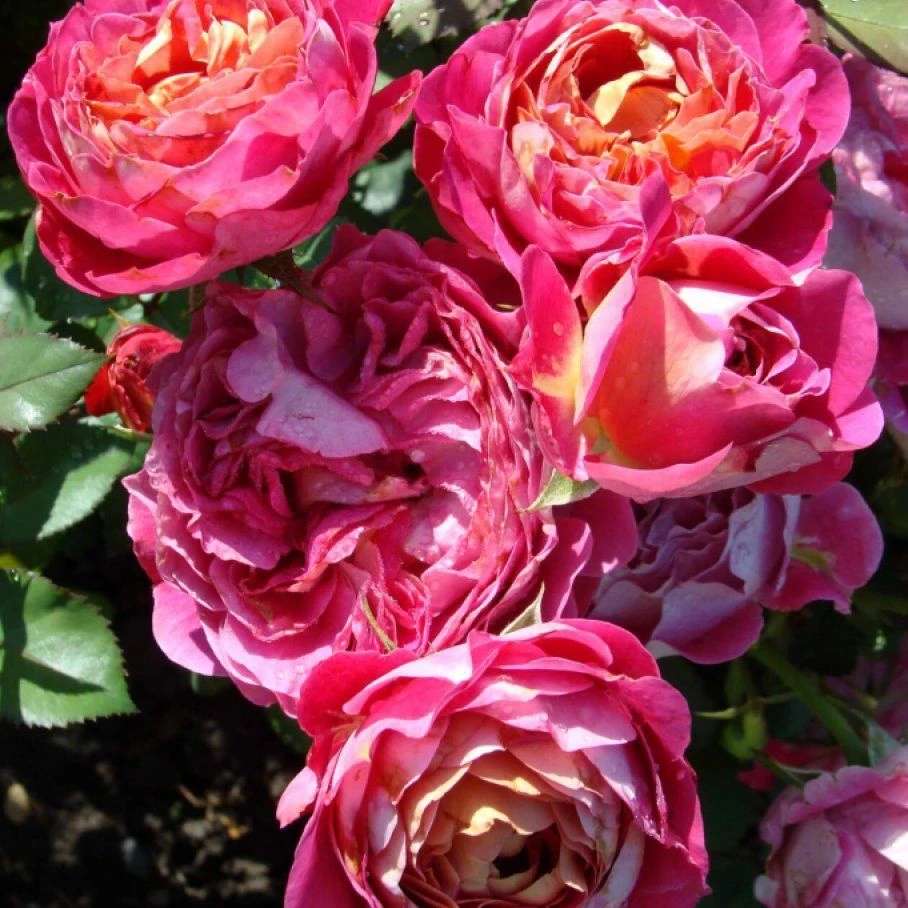 Описание: Необыкновенно сильный аромат фруктов. Куст сильный, прямостоячий, хорошо разветвлённый. Листва крупная, с глянцевым блеском. Цветки крупные, густомахровые (до 60 лепестков), старинной чашевидной формы, часто квартированные. Лепестки розовой окраски, внешние лепестки с малиновыми и лавандовыми оттенками, внутренние, более короткие, с золотисто-желтым отливом. Бутоны собраны в соцветия по 3-5 шт. Цветение повторное, обильное и очень продолжительное – с июня до первых заморозков. Сорт характеризуется очень хорошей устойчивостью к заболеваниям. -