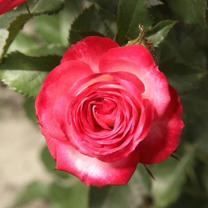 Кремовые лепестки украшены ярко-розовыми кончиками и окантовкой. Распустившийся бутон формирует изящный венчик классической формы.