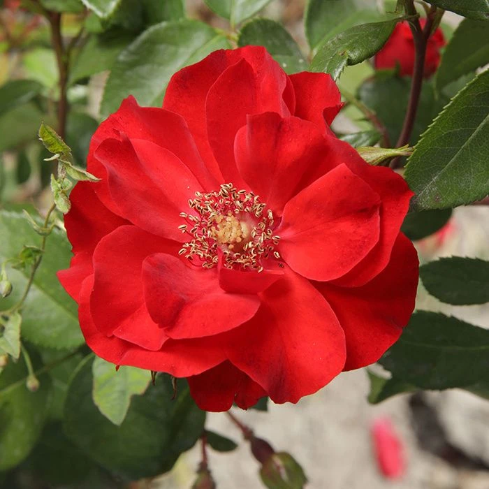 Новый сильный сорт с яркими цветами оригинальной формы. Куст сильнорослый, раскидистый, ветвистый, достигает в высоту 120-140 см. Листва густая, темно-зеленая, кожистая. Листья среднего размера, округлой формы. Бутоны темно-красные, овальной формы, раскрываются в плоскочашечные яркие цветы. Сам цветок среднего размера, 7-9 см в диаметре, полумахровые, может насчитываться 15-35 лепестков. Окрас яркий, насыщенно-красный, блестящий. Появляются в крупных кистях по 10-12 бутонов на одном цветоносе. Цветы долго сохраняют свою форму, устойчивы к дождю, не выгорают.