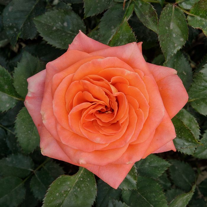 Крупноцветковый сорт. Кус т среднерослый, высотой 80-100 см и шириной около 60 см. Цветки крупные, диаметром 7-9 см, густомахровые,(в них может насчитываться около 60-80 лепестков), квартированные. Лепестки окрашены в уникальный оранжево-красный оттенок, что очень хорошо сочетается с темно-зеленой листвой. Бутоны наполнены умеренным, фруктовым ароматом. Идеально подходит для срезки.