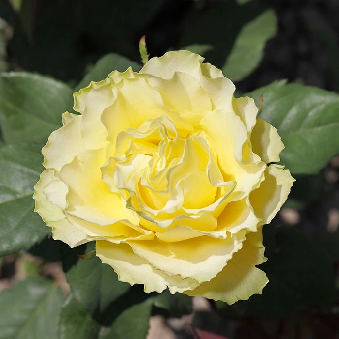 Бутоны имеют форму конуса, лепестки у цветка с фестончатым, волнистым краем. Цветок густомахровый, с приятным нежным ароматом. Распускаясь, бутон принимает форму чаши, диаметром 8-10 см. Лепестки окрашены в нежно-желтый цвет, с зеленоватым отливом. Цветение обильное, повторное. Куст высотой около 80 см, практически лишен шипов. Листва крупная, глянцевая. Устойчивость к болезням и морозам средняя.