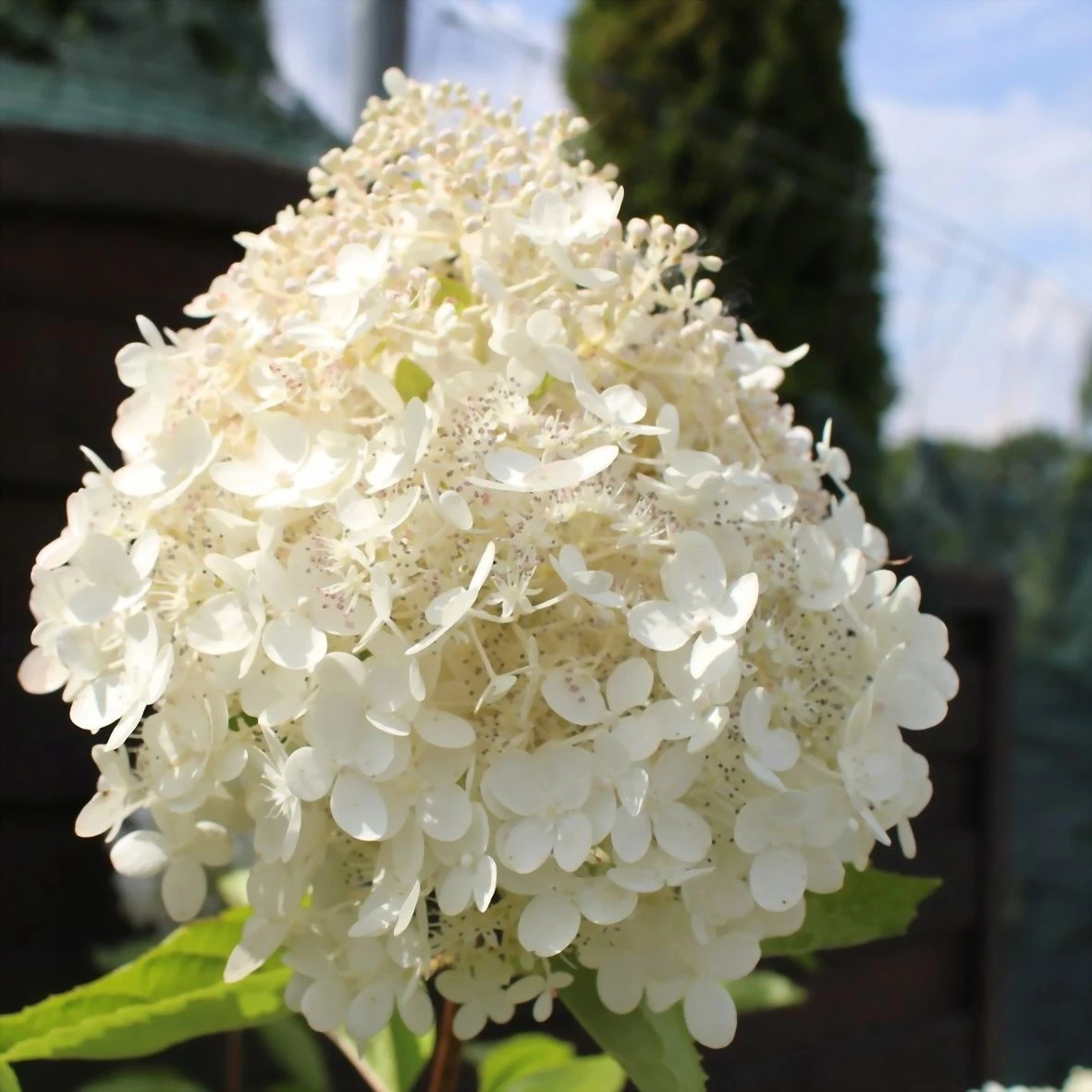 Обильно цветёт в июне-сентябре кремово-белыми соцветиями, диаметром до 20см! -