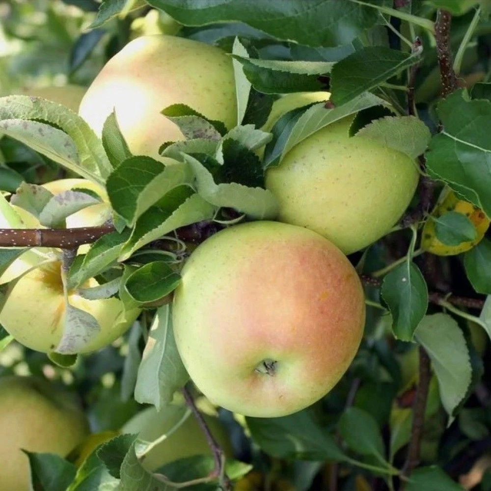 Крона плоская, средней густоты. Плодоношение на 2-3 год. Плоды средней массой 90-120 г, округлые, зеленовато-желтые с красным румянцем.