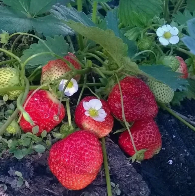 Непревзойденный чемпион по урожайности (1,7-2 кг) с куста. Сроки созревания очень ранние. Плоды формируются с конца мая по октябрь. Ягода конусовидная, бугристая, массой до 50г, ярко-алая, глянцевая, сладкого десертного, медового вкуса. Плодоносит с конца мая до заморозков.