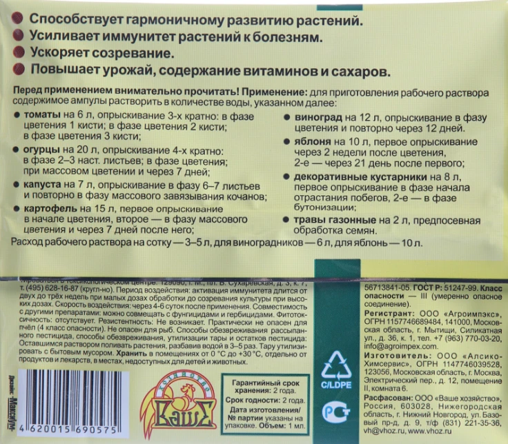 Препарат оказывает мощное стимулирующее действие на обменные процессы в органах и тканях растения, ускоряет рост и развитие корневой системы, побегов и листьев, формирование урожая, укрепляет устойчивость к заболеваниям и неблагоприятным условиям,