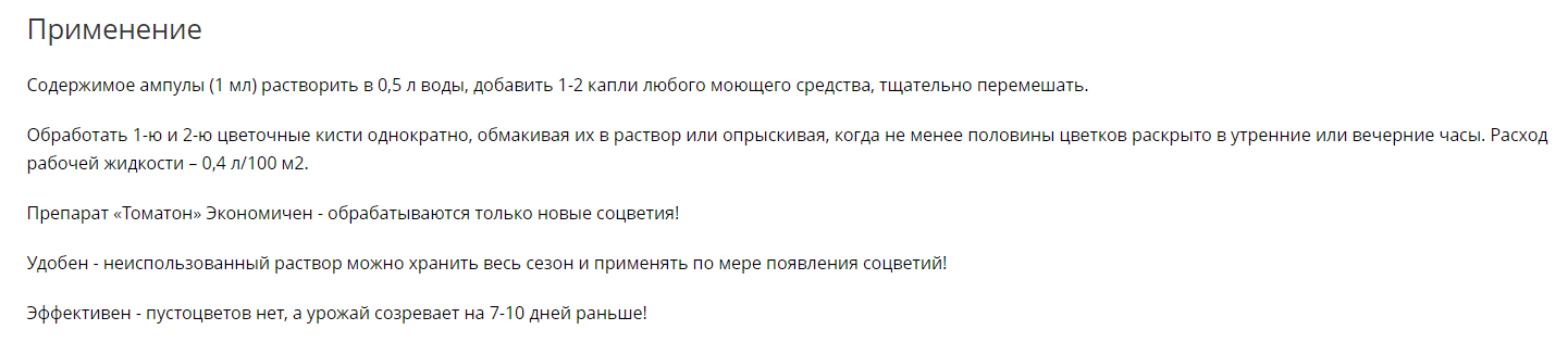 Полученным раствором опрыскивать первую и вторую цветочные кисти однократно, когда не менее половины цветков раскрыты, в утренние или вечерние часы.