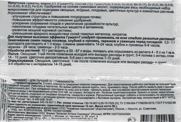 Cоли гуминовых и фульво кислот 80-84%, K 7%, S 0,75%, B 0,3%, Mo 0,018%, Mn 0,12%, Cu 0,2%,
