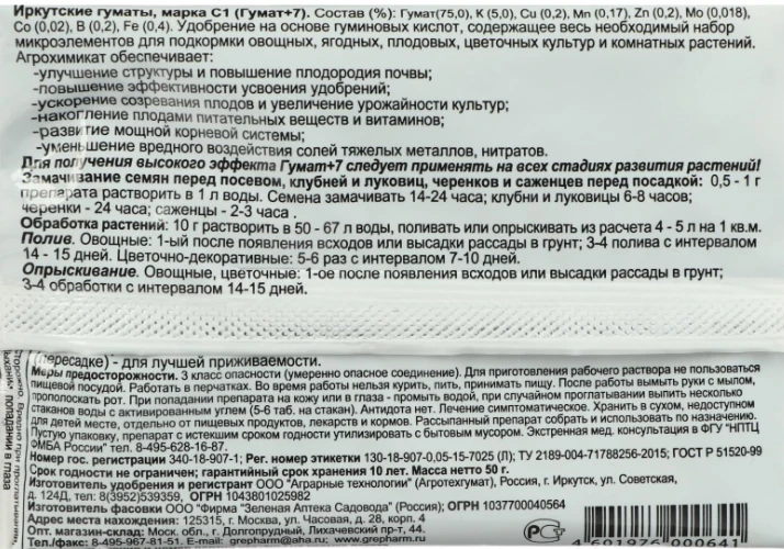 Зеленая Аптека Гумат +7 микроэлементов – удобрение на основе гуминовых кислот, содержащее весь необходимый набор микроэлементов.