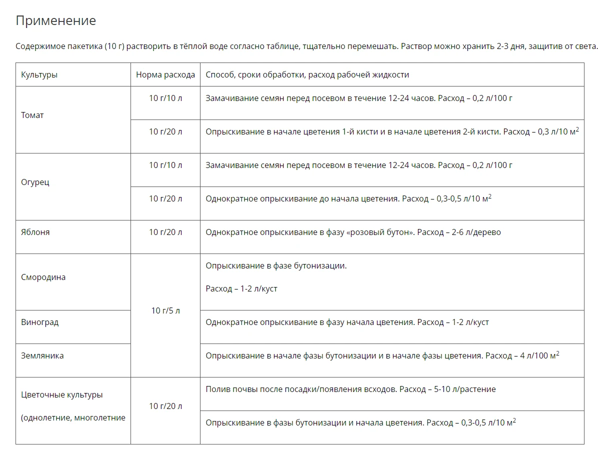 Применяется в качестве внекорневой подкормки овощных, плодово-ягодных, цветочных (комнатных и садовых), декоративных культур.
