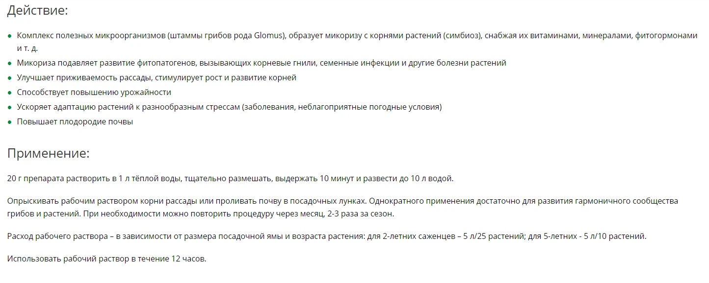 Применяется для корневой и внекорневой обработки корней саженцев и почвы в посадочных лунках.